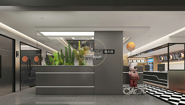 前台区:以简洁灰色吧台 + 绿植装饰为核心,搭配潮玩摆件与暖光氛围灯,兼具接待与打卡属性,快速传递品牌调性。