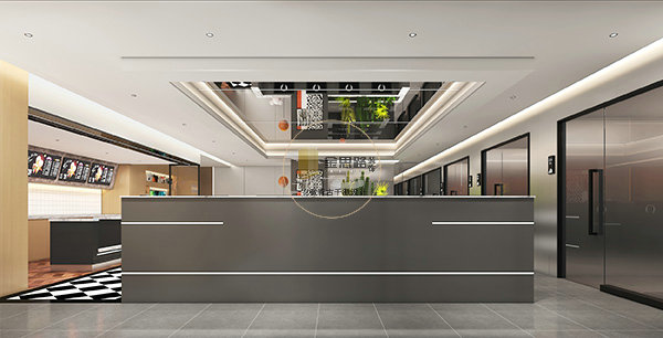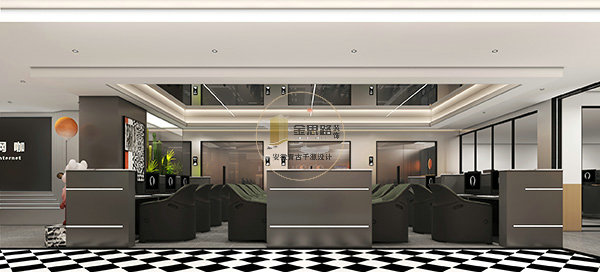 公共区域采用灰调地砖 + 黑白棋盘格分区,搭配浅灰墙面与线性灯带,营造干净通透的视觉感受,同时清晰划分前台、休闲区与上网区。