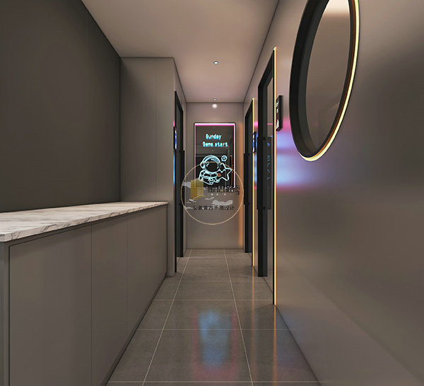 细节上通过霓虹灯牌、橙色圆形装饰等潮酷元素,强化电竞属性,同时保证空间整洁有序,提升顾客体验感。