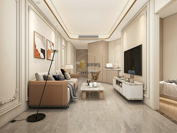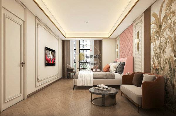 轻奢法式款:石膏线 + 皮质沙发,粉色软包床头 + 植物壁画,温馨有仪式感。