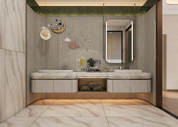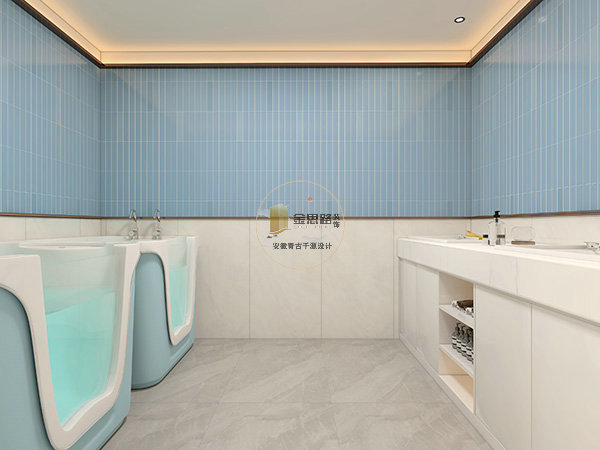 双盆护理区:浅蓝 + 白瓷砖,双盆设计避免交叉使用,暖光灯带防眩光。