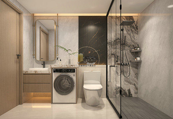 主卫区:干湿分离,智能马桶 + 壁挂洗衣机,防滑地砖 + 圆角设计保障安全。