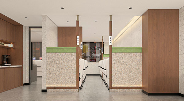 核心材质:水磨石(前台、隔断)、实木木饰面(墙面、柜体)、艺术漆(背景墙)、防滑大尺寸瓷砖(地面),兼顾耐用性与颜值,适配网咖高频使用场景。