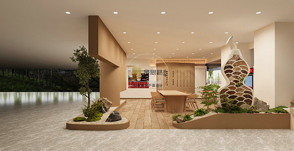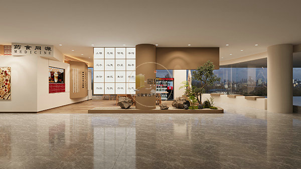 以中医文化为根基,用暖棕、米白等自然色调,搭配原木、石材、绿植等材质,营造温润、静谧的疗愈氛围,将 “药食同源”“五行养生” 转化为可视化空间语言,实现 “空间即疗愈” 的目标。