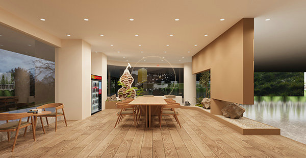 休憩体验区:原木长桌 + 简约座椅,围合出交流空间;内嵌枯山水微景观,搭配智能书柜,满足品茶、阅读需求。