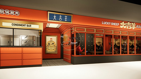 主色调为故宫橙红,复刻京城宫门元素(门钉、兽首衔环),搭配青花瓷器与传统装饰,快速建立老北京文化认知。明档调料台,兼顾功能展示与客流引导。