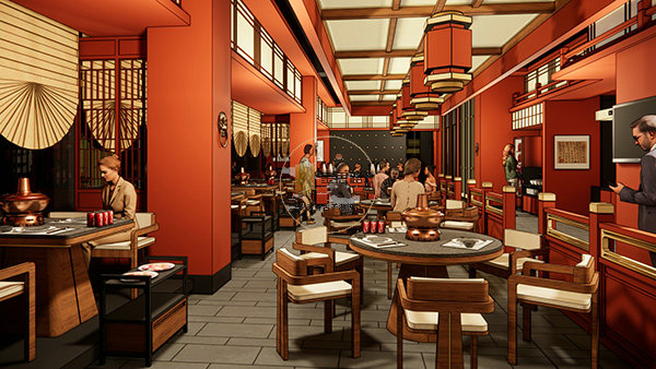 散座区:以中式灯笼、木作隔断、扇形窗棂营造围合感,铜锅餐桌为核心视觉符号,暖光氛围适配家庭、朋友聚餐。