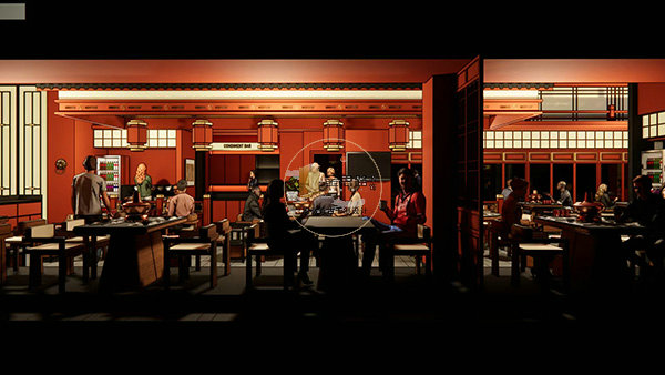 现代简约建筑基底,搭配红金撞色中式招牌,书法字体与金属质感结合,强化品牌识别。弧形灯带与玻璃幕墙,提升夜间视觉辨识度与商业氛围。