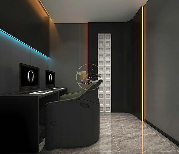 质:大面积运用灰色大理石地砖、木饰面硬包、金属线条与磨砂玻璃,通过材质对比提升空间精致度,弱化电竞空间的廉价感。