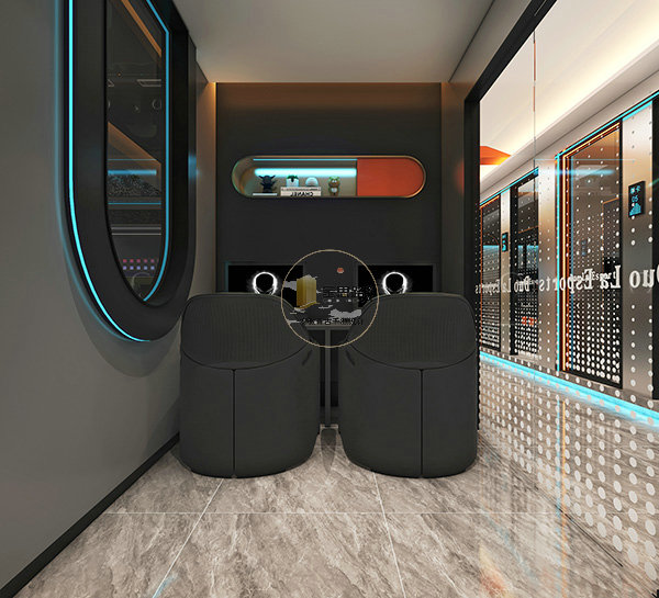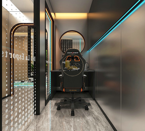 内部配置舒适电竞椅、简约置物架与氛围灯,实现 “电竞 + 休憩” 双功能。