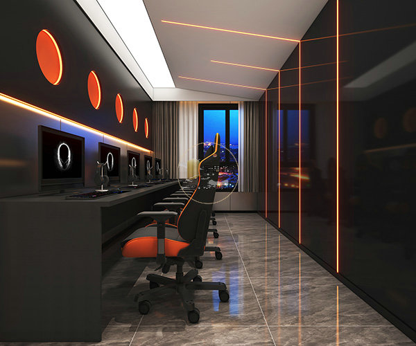 多排电竞机位对称布局,搭配星空顶与橙色环形装饰灯,满足团队开黑需求,同时形成视觉焦点。