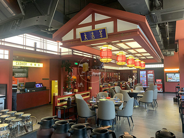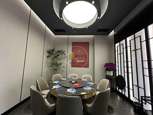 重点照明:包厢圆形吊灯、散座宫灯聚焦餐桌,突出用餐核心区。