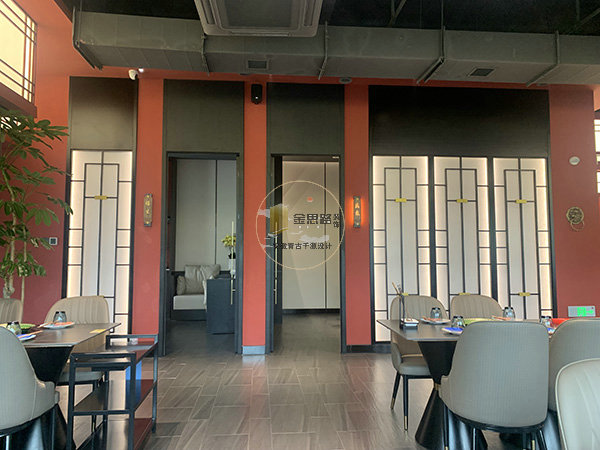 以 “红墙黛瓦,京韵新生” 为理念,用现代手法演绎传统京味:色彩上以朱红 + 炭黑 + 米灰为主色调,呼应老北京红墙与胡同灰瓦。材质上结合木质格栅、金属线条、磨砂玻璃,平衡传统厚重与现代轻盈。功能上兼顾私密包厢与开放散座,满足不同客群需求。