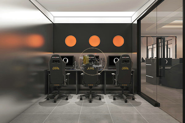 细节上通过霓虹灯牌、橙色圆形装饰等潮酷元素,强化电竞属性,同时保证空间整洁有序,提升顾客体验感。
