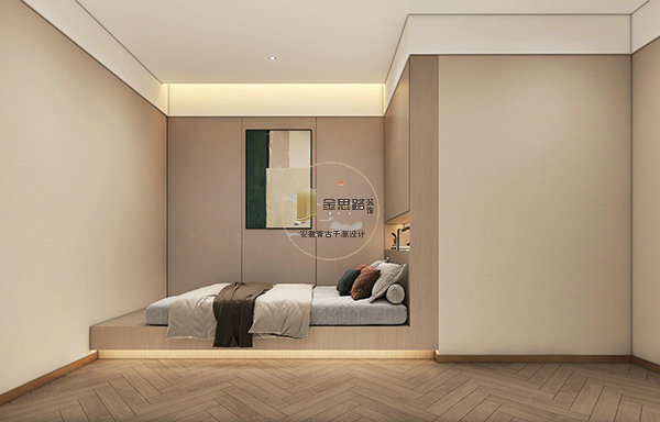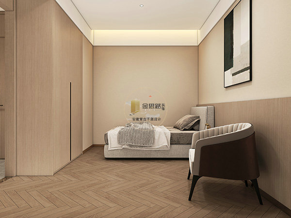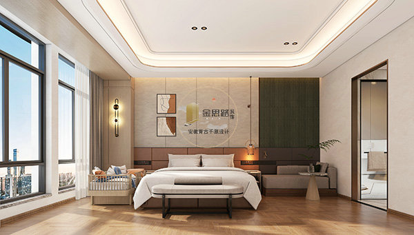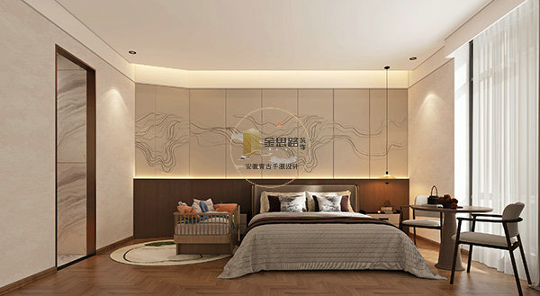 现代简约款:紧凑套房,浅灰布艺 + 线性灯,波浪硬包背景,功能紧凑。