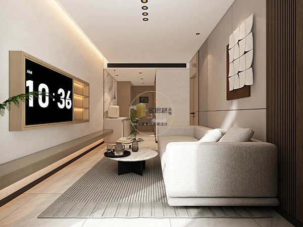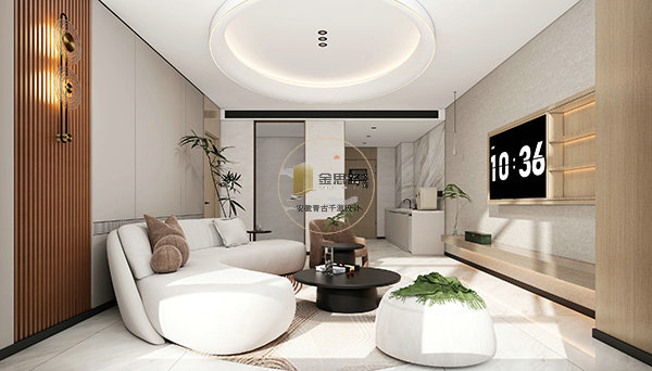 起居区:无主灯设计 + 圆润家具,木格栅电视墙兼顾收纳,大尺寸瓷砖易清洁。