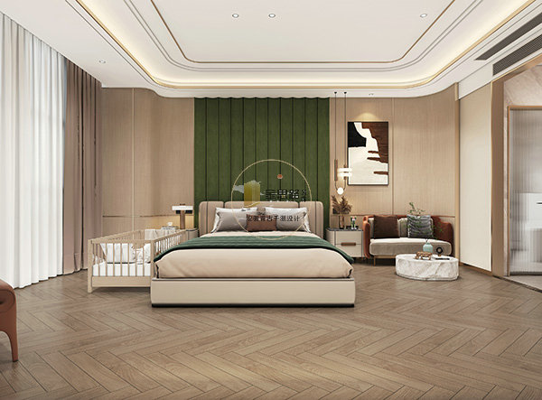 主卧:落地窗 + 双层帘,婴儿床紧邻主床,软包背景 + 氛围灯助眠,人字拼地板降噪。