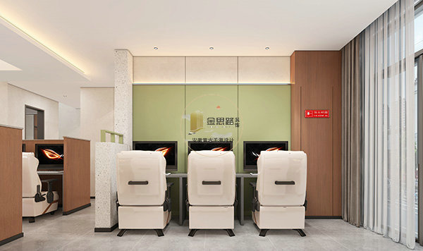 以「原木 + 水磨石 + 莫兰迪绿」为核心基调,融合现代简约与轻奢质感,弱化传统网咖的嘈杂感,强化空间的通透感与舒适度,实现「电竞区 + 休闲区 + 服务区」的功能分区,让电竞体验从 “玩” 升级为 “沉浸式享受”。
