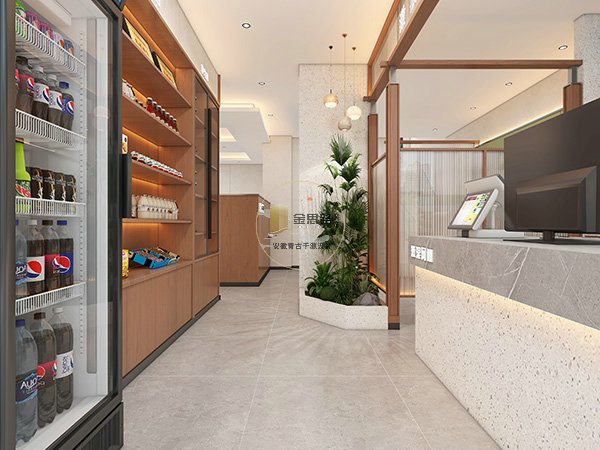 前台服务区:采用水磨石台面 + 木格栅门头,搭配绿植造景,打造通透迎宾感,同时设置饮品展示柜,满足玩家即时消费需求,兼顾颜值与实用性。