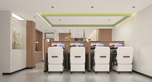 细节升级:定制编号式座位牌,方便玩家定位;增设休闲水吧区,提供饮品补给;玻璃隔断 + 绿植造景,弱化空间压抑感,保证采光通透。