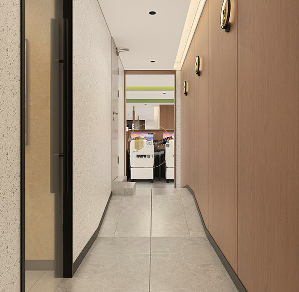 核心材质:水磨石(前台、隔断)、实木木饰面(墙面、柜体)、艺术漆(背景墙)、防滑大尺寸瓷砖(地面),兼顾耐用性与颜值,适配网咖高频使用场景。
