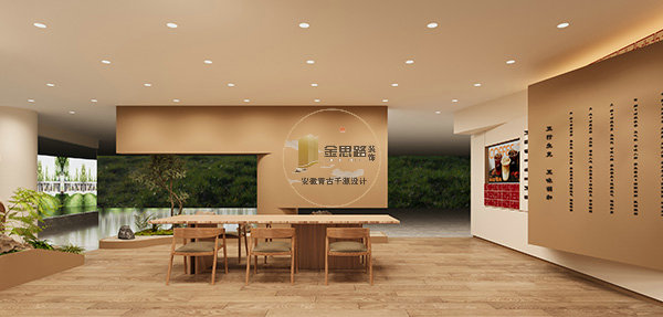 休憩体验区:原木长桌 + 简约座椅,围合出交流空间;内嵌枯山水微景观,搭配智能书柜,满足品茶、阅读需求。