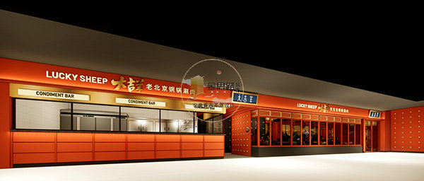 主色调为故宫橙红,复刻京城宫门元素(门钉、兽首衔环),搭配青花瓷器与传统装饰,快速建立老北京文化认知。明档调料台,兼顾功能展示与客流引导。
