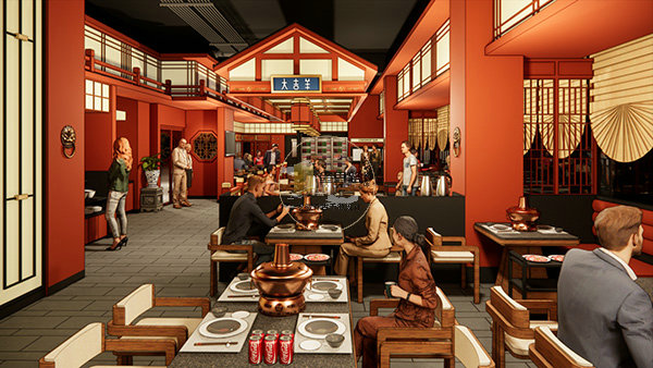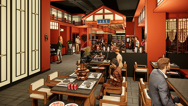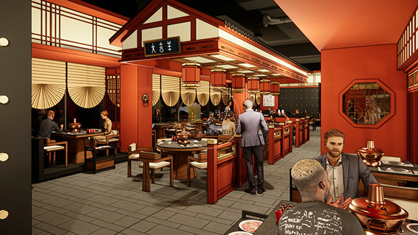 散座区:以中式灯笼、木作隔断、扇形窗棂营造围合感,铜锅餐桌为核心视觉符号,暖光氛围适配家庭、朋友聚餐。