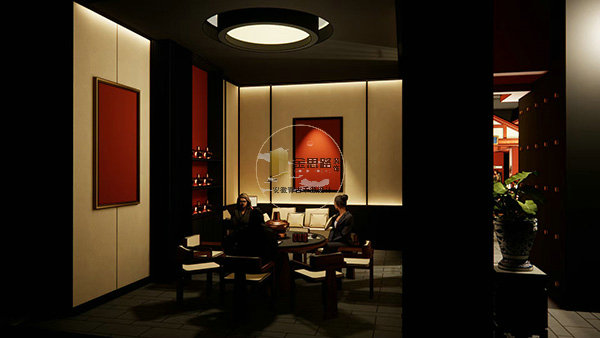 包间区:米白硬包 + 红墙撞色,搭配环形顶光与艺术画框,打造静谧、有格调的商务宴请与私密聚会场景。
