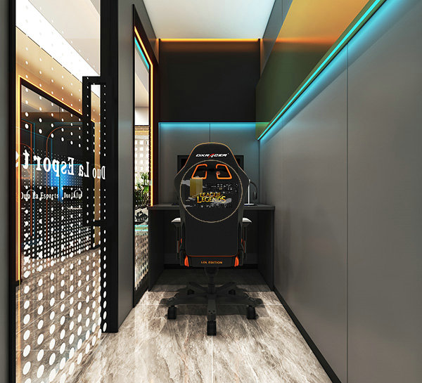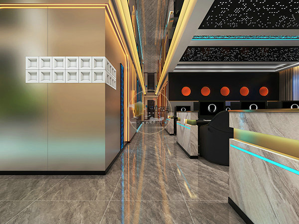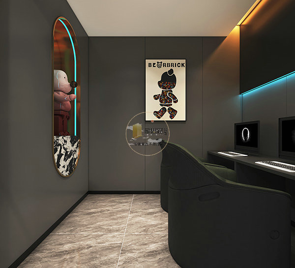质:大面积运用灰色大理石地砖、木饰面硬包、金属线条与磨砂玻璃,通过材质对比提升空间精致度,弱化电竞空间的廉价感。