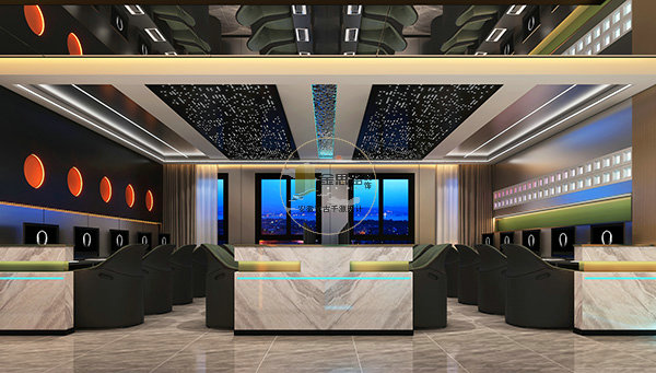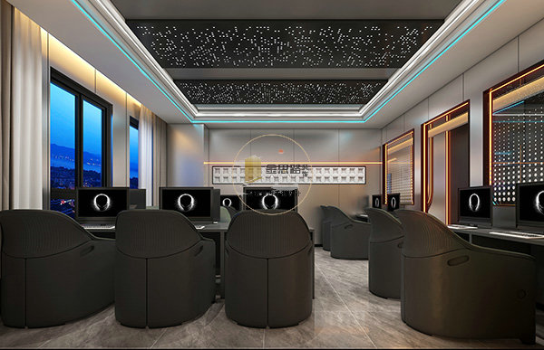 多排电竞机位对称布局,搭配星空顶与橙色环形装饰灯,满足团队开黑需求,同时形成视觉焦点。