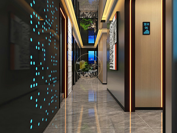 以线性地灯引导动线,墙面运用点状发光墙、立体水泥砖与艺术画,打造沉浸式过渡空间。