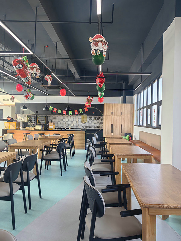 设计风格:温馨治愈风,浅木色餐桌椅 + 浅绿 / 浅灰双色地胶,营造轻松休闲的氛围。
