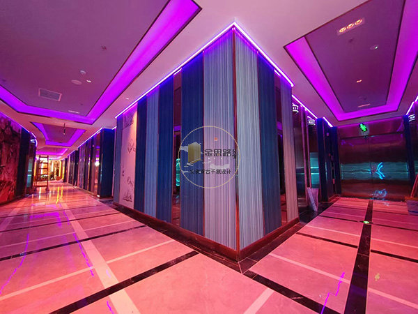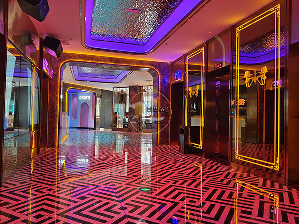 前厅与走廊:采用黑白几何拼花地砖+水波纹金属吊顶,搭配暖橙 / 紫蓝氛围灯带,强化空间纵深感与高级感;前台使用大理石台面 + 发光字标识,视觉聚焦且品牌感强。