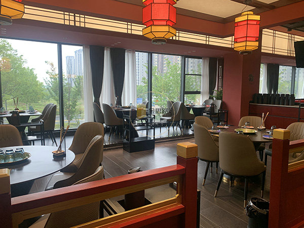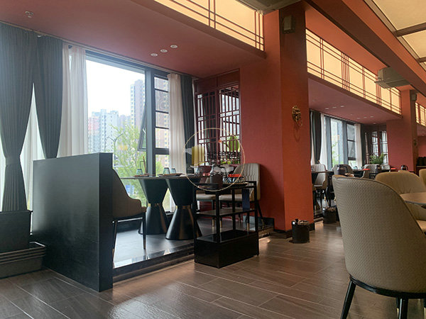 布局:以 4 人方桌与 6 人圆桌为主,沿落地窗排布,最大化引入自然采光,窗外绿意与城市景观提升用餐体验。