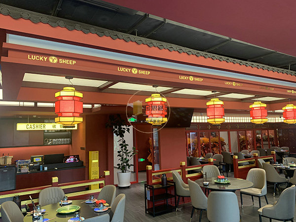门头与入口:采用仿四合院坡顶造型,搭配烫金 “大吉羊” 牌匾与 “LUCKY SHEEP” 英文标识,红框木格栅窗与红灯笼强化京味辨识度。