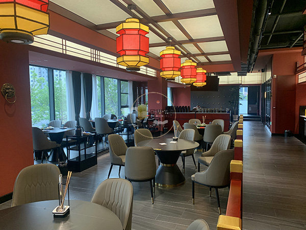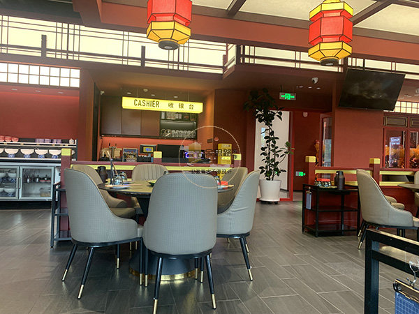 重点照明:包厢圆形吊灯、散座宫灯聚焦餐桌,突出用餐核心区。