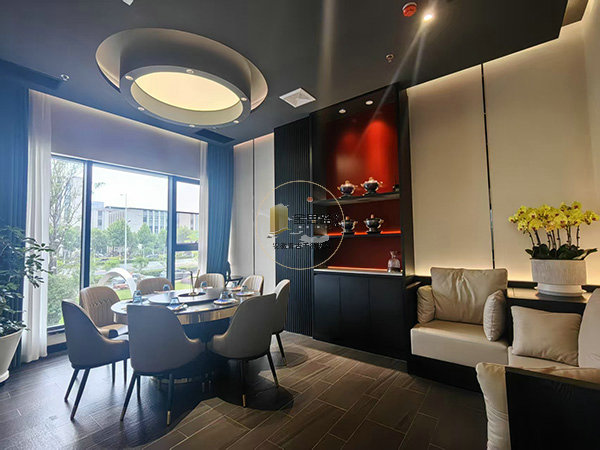 顶面:圆形轻奢吊灯 + 黑色吊顶,灯光聚焦餐桌,强化仪式感。